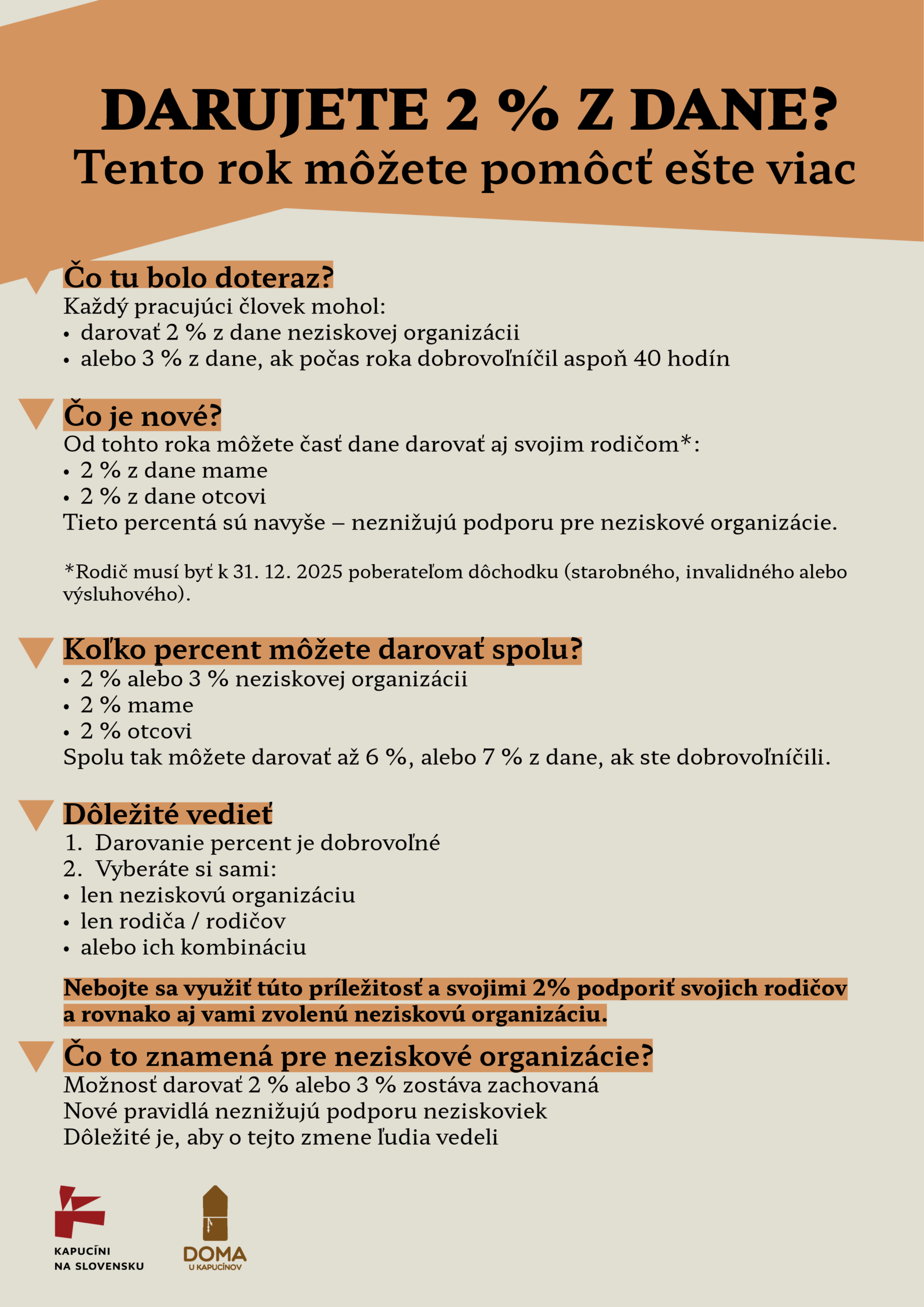 - Fyzické osoby poukazujú v roku 2026 iba 2% z dane, dobrovoľníci môžu poukázať 3% z dane.
